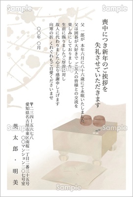 セピア調の淡い水彩画で描かれた碁盤と碁笥、座布団。碁を指す時間を共に過ごした相手を偲ぶような静けさを感じさせる喪中はがきデザインです。囲碁を愛した故人を知る親しい方へのご挨拶に。