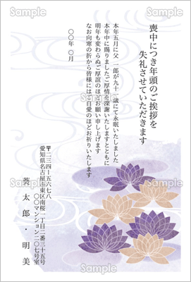 流水紋を背景に、紫と淡いベージュの蓮の花をあしらった喪中はがきテンプレートです。和の趣を生かしつつもグラフィカルにデザインされ、落ち着いた品のある印象に仕上がっています。